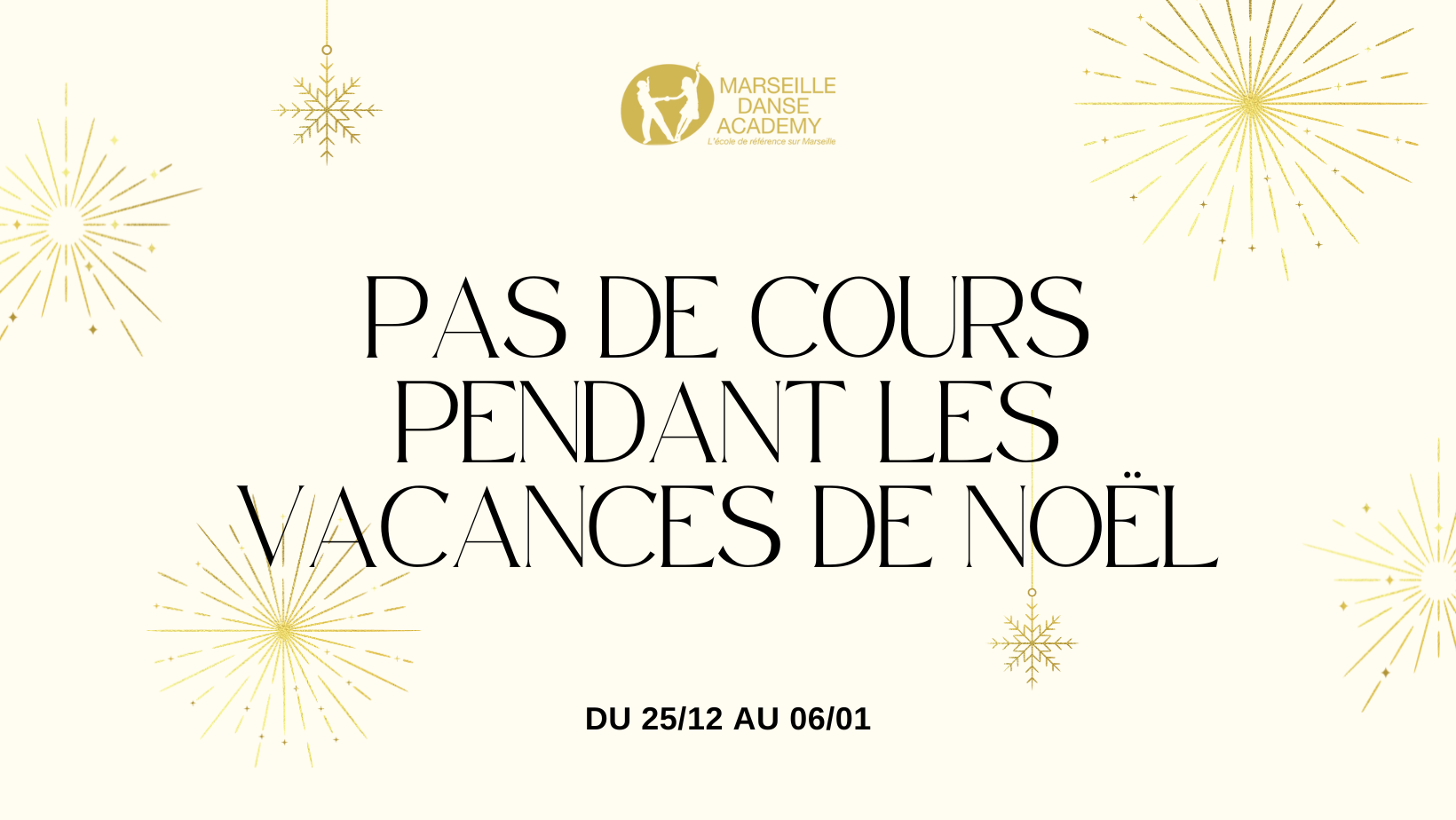 Chers danseurs et danseuses, Nous vous informons qu’il n’y aura pas de cours à l’école de danse pendant les deux semaines de vacances de Noël,